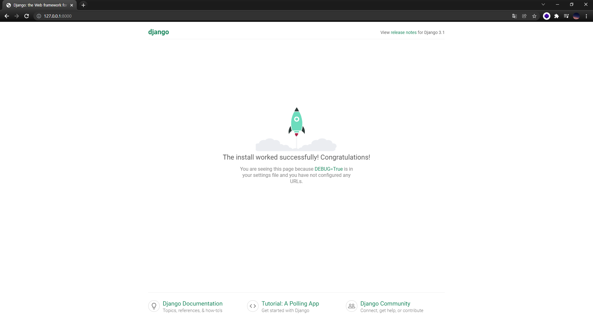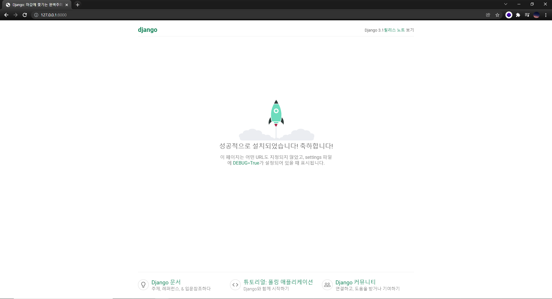 개발 서버가 http://127.0.0.1:8000/ URL 경로에 배포가 되었다고 하니 브라우저를 열고 접속해봅시다.