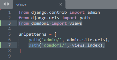 2. config/urls.py 파일에서 URL 패턴을 해석하여 /domdomi/ URL에 매핑되어 있는 domdomi/views.py 파일의 index 함수를 호출하여 줍니다.