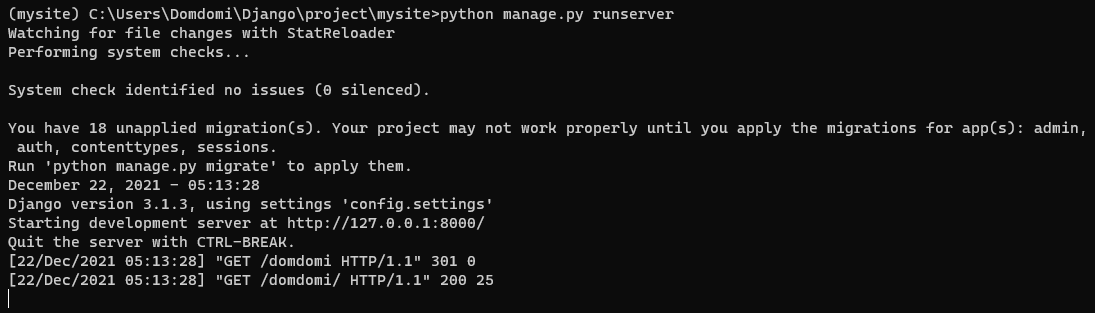 그러면 이제 장고 웹 서버에서는 사용자가 브라우저의 URL 입력창에서 /domdomi/라는 경로를 요청하게 되면 views.index 즉, domdomi 앱에 있는 views.py 파일의 index 함수를 수행하게 될 것입니다. 그리고 그 index 함수에 정의되어 있는 기능인 HttpResponse 함수를 호출하여 인자 값으로 들어있는 문자열을 사용자 브라우저에 출력시켜주는 것으로 기능이 마무리될 것입니다.