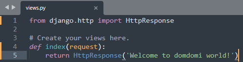 이제 장고 웹 서버에서는 사용자가 URL에서 /domdomi/ 라는 경로(path)를 요청하게 되면 어떤 기능(함수)를 수행시켜야 하는 지 알게 되었습니다. 이제는 그 함수, 즉 views.index 가 어떤 기능을 수행할 것인지만 정의해주면 되겠습니다.
