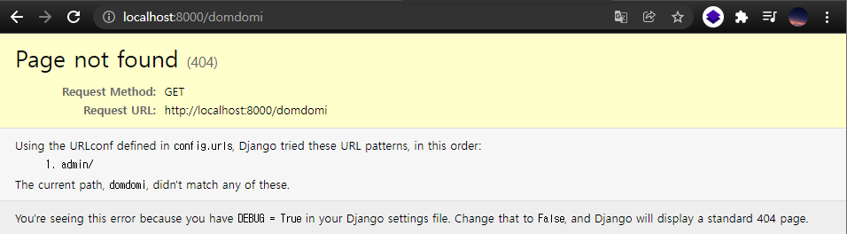 해석하면, "config.urls 설정에 일치하는 URL 패턴이 발견되지 않았다. 현재 등록된 패턴은 admin/ 이 있고, domdomi/ 라는 경로는 어떤 것도 일치하는 것이 없다." 입니다.