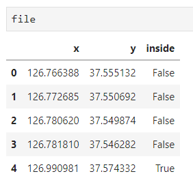 x, y 좌표 컬럼을 넣고 True, False 값을 판다스 file의 inside 컬럼에 넣어주었어요.