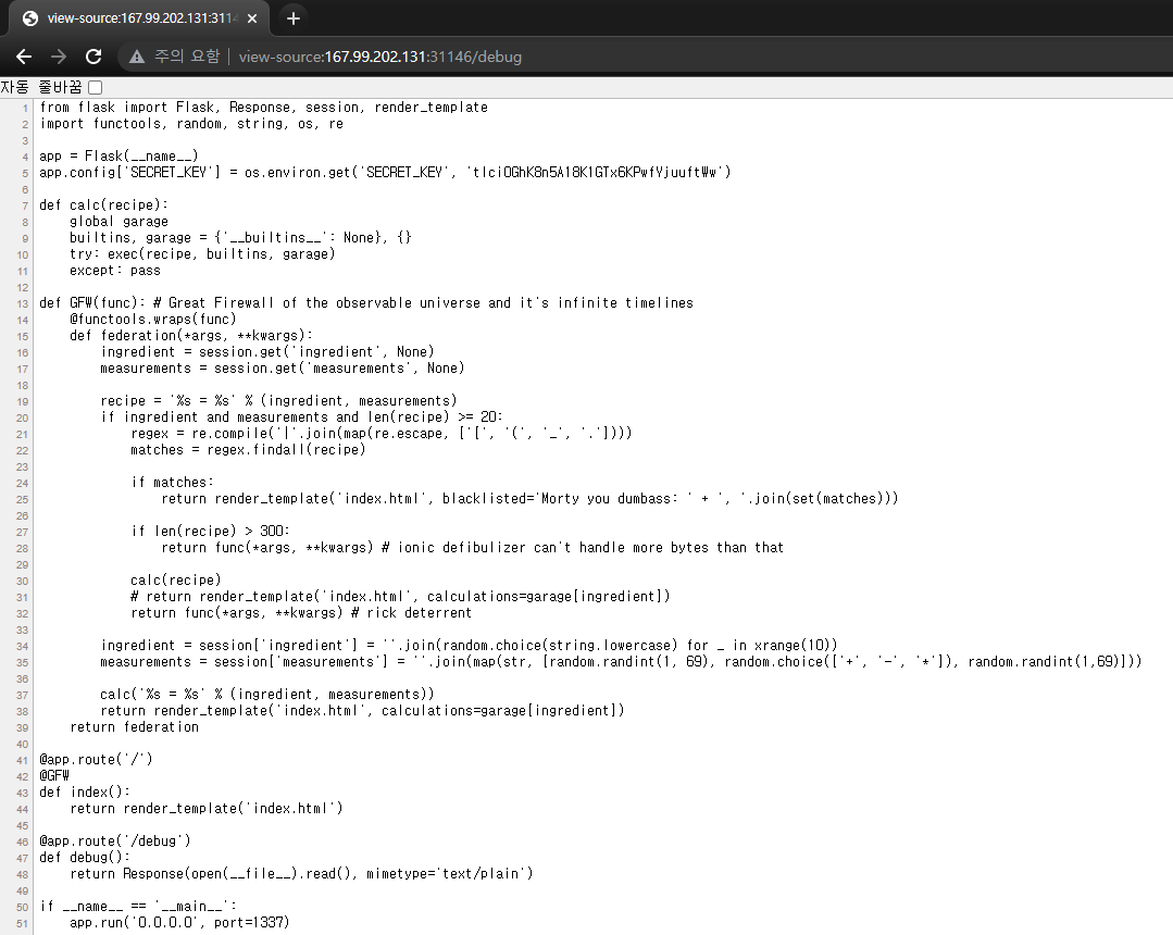 /debug 경로에 접속해보면 아래와 같이 웹서버의 소스코드를 그대로 볼 수 있습니다.