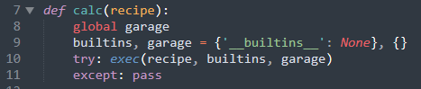 calc(recipe) # exec(recipe, builtins, garage)