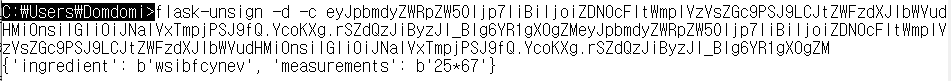 1. Flask 세션 쿠키에 존재하는 Data 부분의 ingredient 와 measurements 속성의 값을 조작한다.