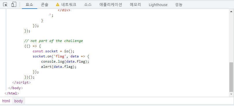 flag의 내용이 클라이언트 사이드에서 alert 로 팝업되는 것 같았습니다.