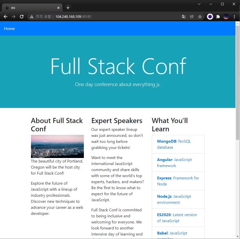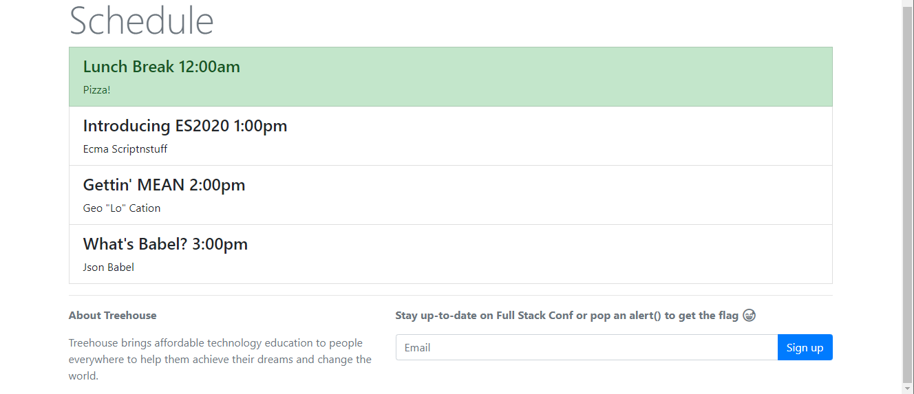 Welcome to Full Stack Conf, explore the future of JavaScript with a lineup of industry professionals and discover new techniques to advance your career as a web developer. But be very careful with the stay up to date form, we don't sanitize anything and the admin logs in and checks the emails regularly, don't try anything funny!! 😅
