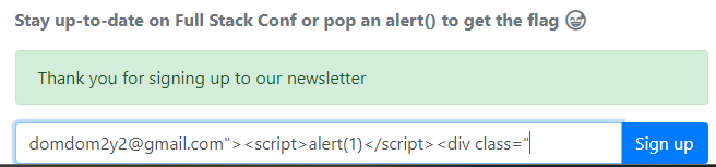 여러차례 입력해보고 Sign up 버튼을 눌러서 XSS 가 걸리는 지 확인해봐야 했습니다.