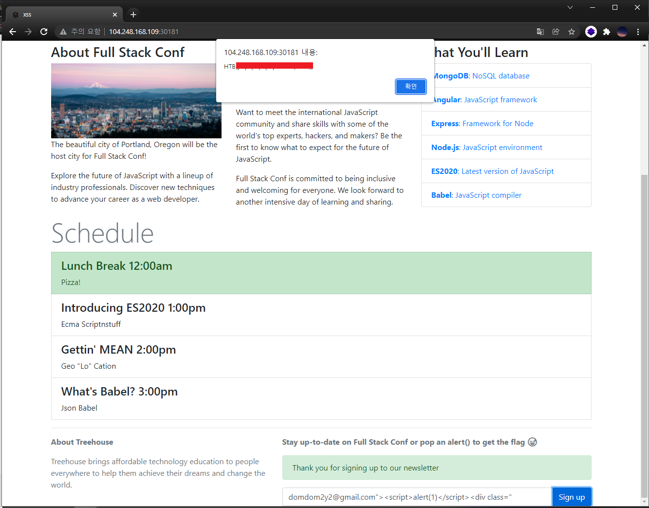 그래서 아까 언급했던 대로 가장 일반적인 XSS 페이로드를 Email 에 입력해서 제출해보았습니다.
