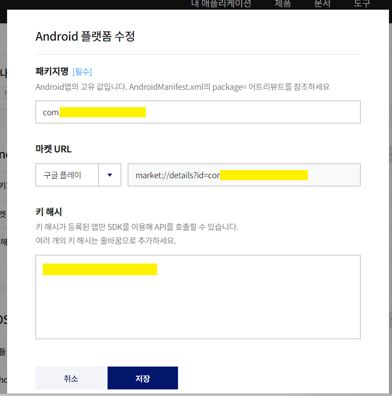 아래 보이는 "플랫폼"에서 Android, iOS 패키지명을 입력해주세요!