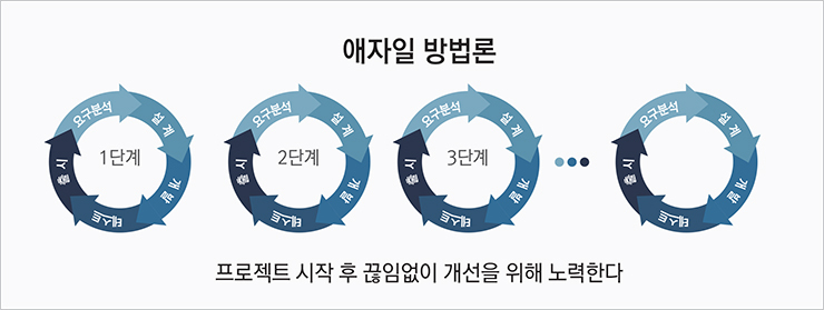 | 개발/검증 | 반복 주기 단위로 SW 개발, 검증 | 분석/설계/구현/테스트를 순차적 수행 |