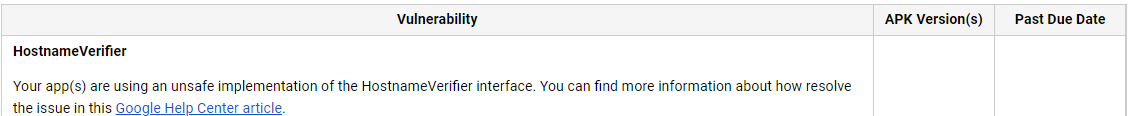 HostnameVerfier Your app(s) are using un unsafe implementation of the HostnameVerifier interface. You can find more information about how resolve the issue in this Google Help Center article.