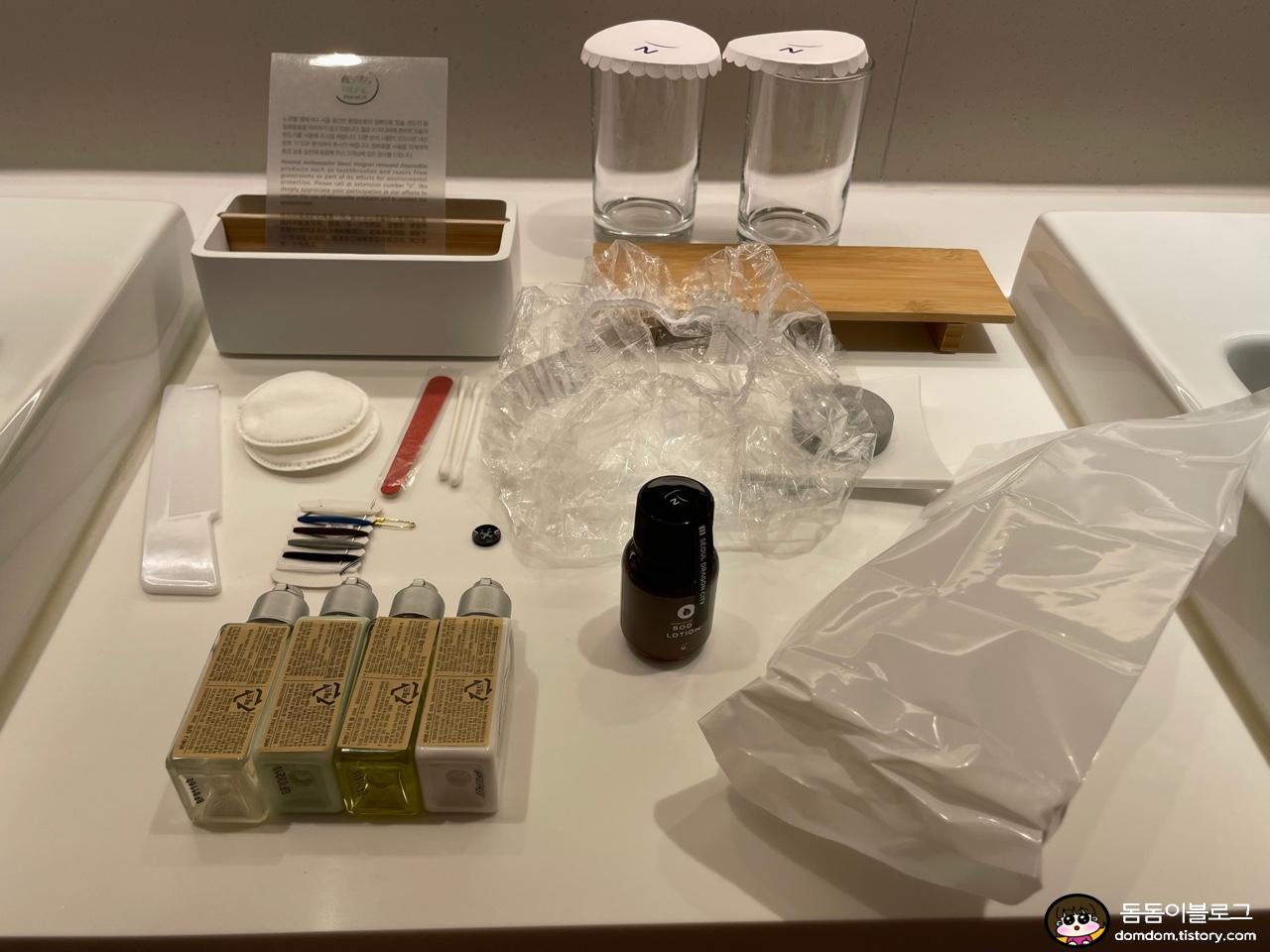 화장실에는 환경보호의 일환으로 일회용품은 비치되어 있지 않았고 (칫솔, 면도기 등)