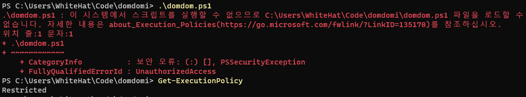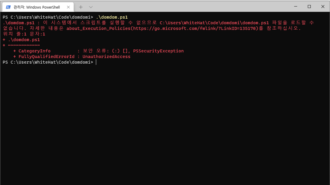 혹시 위와 같은 오류를 보셨을까요? .ps1 은 powershell 확장자를 뜻합니다. 위 상황은 domdom.ps1 이란 파일을 관리자 모드로 실행한 powershell 에서 실행하고자 했는데 바로 "이 시스템에서 스크립트를 실행할 수 없으므로... .ps1 파일을 로드할 수 없습니다. ~ UnauthorizedAccess" 오류가 난 상황입니다.