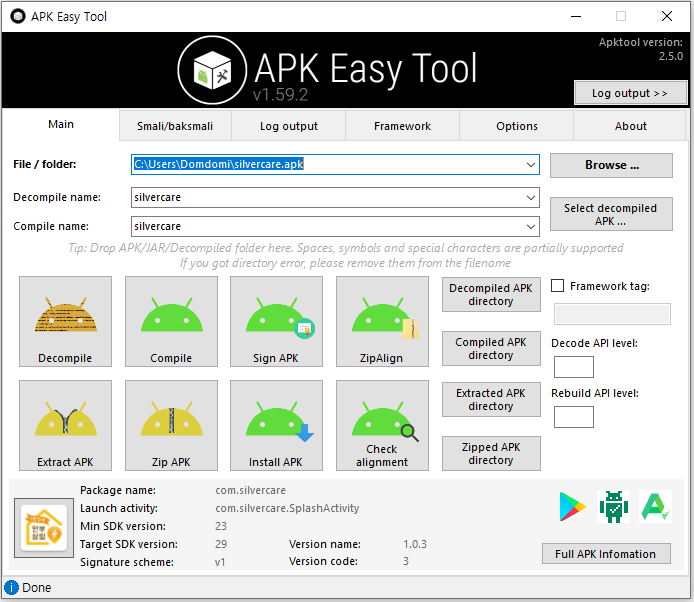 APK Easy Tool 내부에 apktool, signer, zipaligner 등등의 도구가 모두 포함되어 있기 때문에 별도의 다운로드 및 설치나 keystore 를 따로 만들 필요 없이 모두 클릭 몇 번으로 편하게 APK 파일을 디컴파일, 컴파일, 추출, 압축, 인증서 서명, 리패키징 등의 기능을 수행할 수 있습니다.