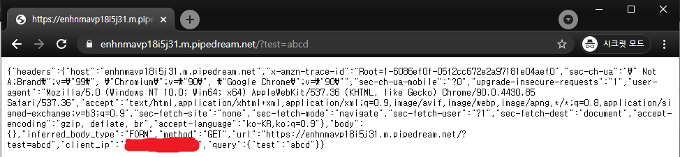 한번 해보겠다. 제공받은 임의의 URL주소를 브라우저 URL 주소 입력란에 입력하고, 뒤에 파라미터를 테스트용으로 한 개 적어서 보내줘보겠다. 입력한 주소는 아래와 같다. 파라미터는 test에 값으로 abcd를 보내본다.