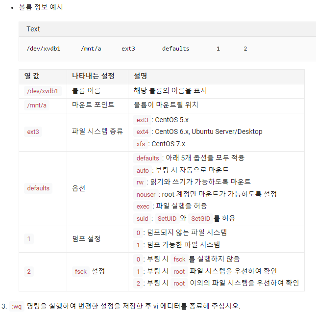 vi /etc/fstab 명령어로 편집기를 열어 아래 순서대로 생성한 스토리지의 설정을 추가합니다.