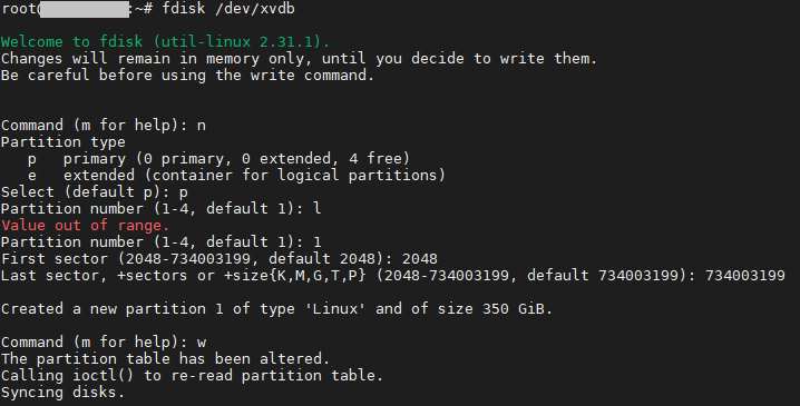 fdisk /dev/xvdb 명령어로 파티션 설정을 합니다