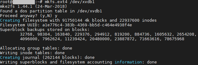우분투서버이므로 mkfs.ext4 /dev/xvdb1 명령어를 입력합니다.
