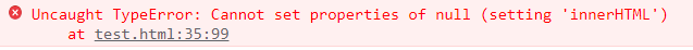 이 경우에는 script 에서 "vuln 이라는 ID를 가진 요소를 찾으려고 보았는데 찾지 못했다!" 라는 결과가 나옵니다. (참고로 아래 이미지에서는 null 요소에 대해서 innerHTML 이라는 속성을 찾지 못했다라고 하는 데요. 결국에는 vuln 이라는 ID를 찾지 못해서 발생한 오류입니다.)