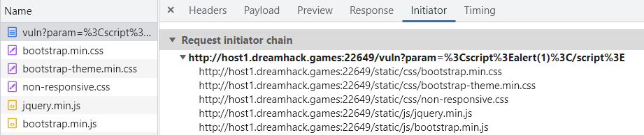 그 증명은 개발자도구의 Network 탭에서 확인할 수 있습니다. (참고로 해당 페이지는 드림핵 문제의 xss-2 문제의 코드를 예시로 드는 것입니다.)