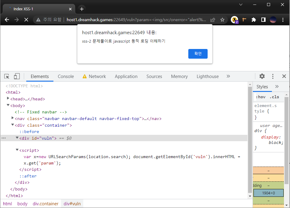해당 문제는 드림핵(dreamhack.io)의 워게임 문제로 등록된 xss-1 또는 xss-2 문제로 Cross Site Scripting의 이해를 돕기 위해 출제된 문제입니다. 문제의 목표는 파라미터를 통한 Reflected XSS 취약점을 발생하게 하면 성공하는 문제인데요. 다만 xss-1 문제에서는 단순히 param 파라미터에 <script>alert(1)</script> 을 넣고 전송하면 페이지에 그대로 script 태그가 삽입되면서 alert(1) 이라는 javascript 코드가 잘 실행되었는데요. 문제는 xss-2 에서는 param 파라미터의 값이 HTML 페이지에 정적으로 로딩되지 않고 동적으로 로딩되면서 실행이 되지 않습니다.