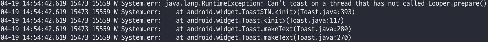 위 오류의 발생원인은 사실 제가 만든 앱이 Thread 에서 동작하는데 Thread handler 에서 Toast 와 같은 UI 기능을 수행하려던 것이 문제였죠. 안드로이드 뿐만 아니라 다른 프로그래밍 언어로 작성된 프로그램들에서도 기본적으로 UI Thread 즉 Main Thread 가 아닌 Thread 에서 UI를 조작하려고 하면 오류가 발생하곤 합니다. 그것처럼 이번 경우도 UI Thread 가 아닌 Thread에서 Toast message 를 띄우려고 하였기 발생한 오류가 바로 위와 스크린샷 이미지와 같습니다.