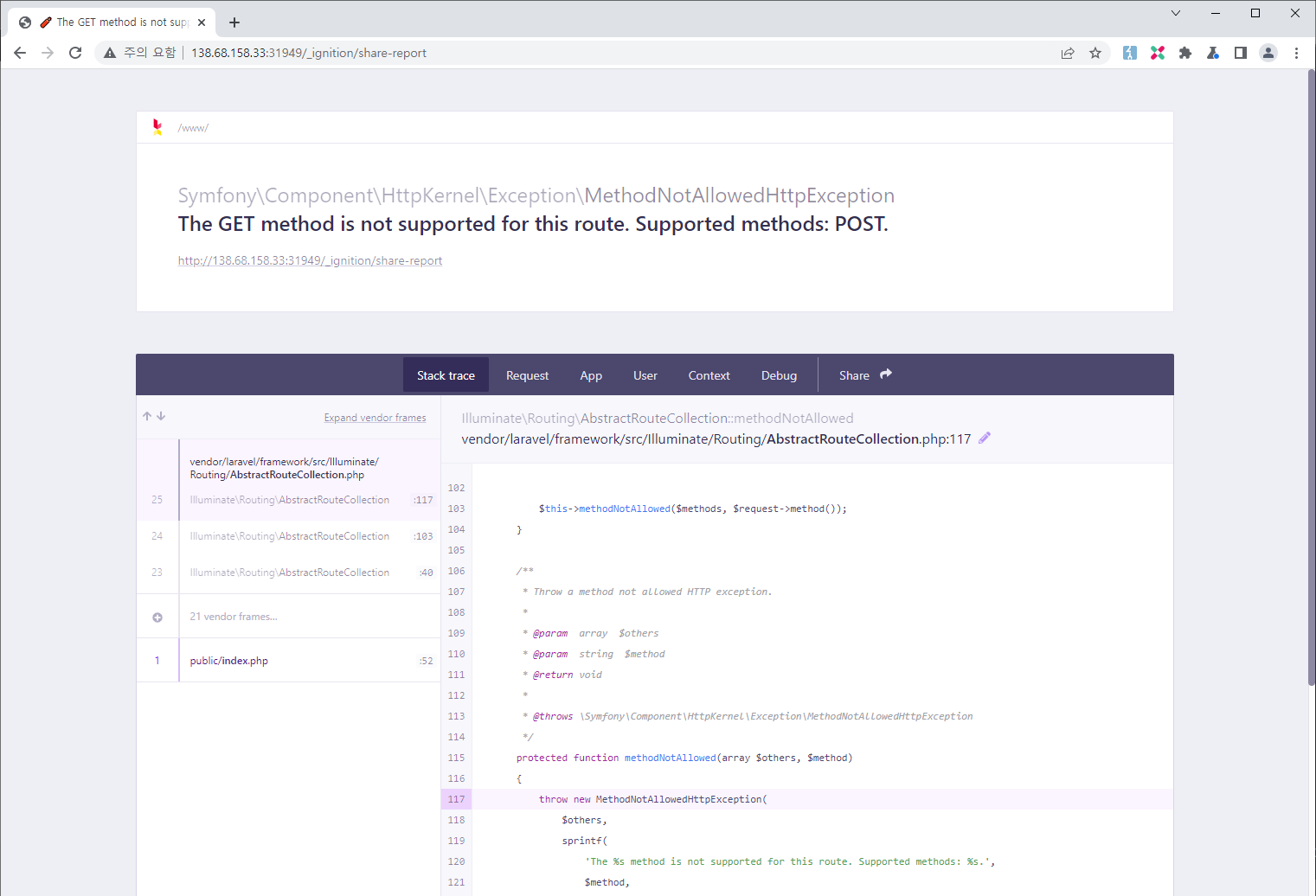 그랬더니 아래와 같이 laravel debug mode on 된 상태의 페이지를 확인할 수 있습니다.