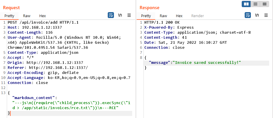 invoice 를 추가할 때 내용 부분으로 markdown content 를 받아오는데, 이를 makePDF 함수에 넣고 RCE 에 취약한 부분이 실행됨을 알 수 있습니다.