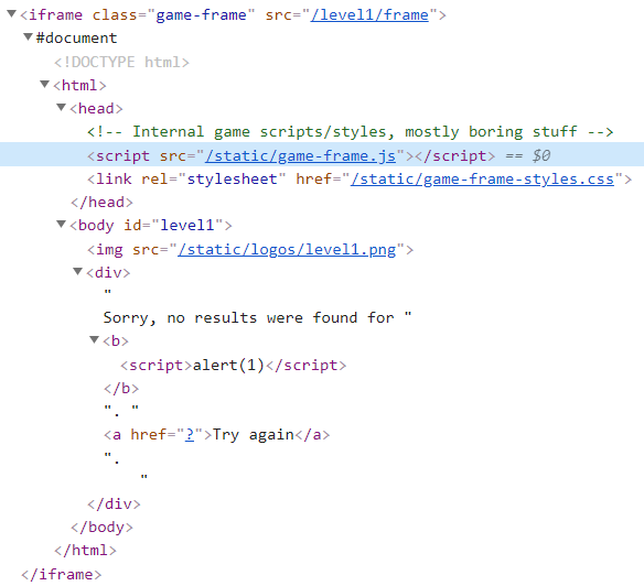 그 비밀은 아래 소스코드의 /static/game-frame.js 파일에서 확인할 수 있다. 아래 소스코드는 level1의 소스코드의 iframe 태그의 내용이다.