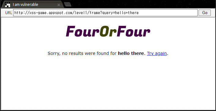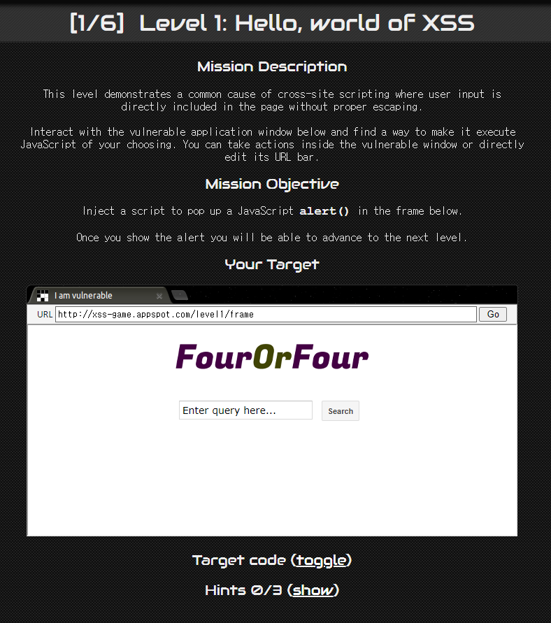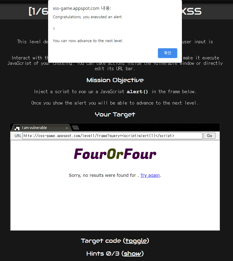 첫 번째 단계의 목표는 alert 창을 띄우는 것이 끝이다. alert 창이라 함은 결국 javascript의 alert() 함수를 의미하겠다.