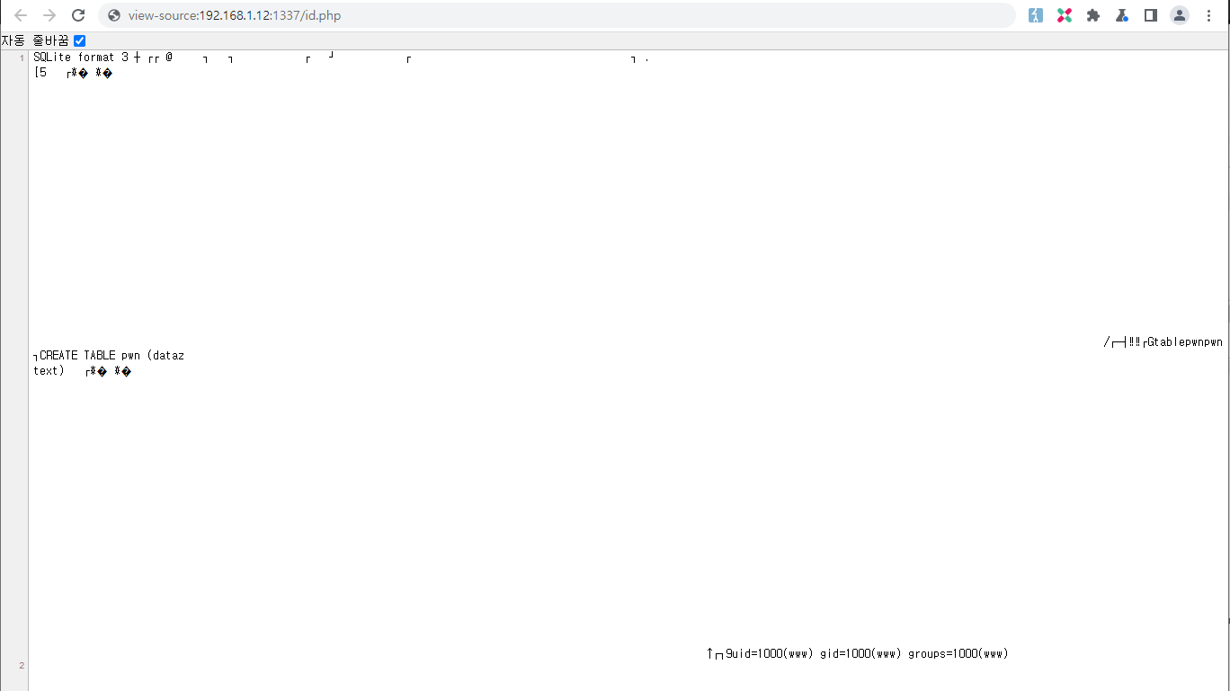 뭔가 SQLite3 포맷이 나오면서 최 하단에 id 명령어 출력 결과 값이 삽입되어 있음을 알 수 있습니다. 실제로 RCE 명령이 잘 실행되어 공격자가 원하는 테이블이 만들어졌고, 또 원하는 명령어가 실행되어 해당 명령어의 내용이 들어가는 테이블이 담긴 db 파일이 실제 id.php 라는 이름의 파일에 attach 된 것을 확인할 수 있습니다.