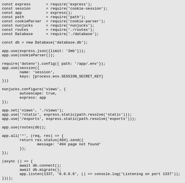 이제 서버의 소스코드를 모두 추출해볼 수 있겠습니다. 서버의 경로는 이미 위에서 확인했던 오류 응답 본문을 통해서 알 수 있습니다. /app/routes/index.js 파일을 우선 조회해보겠습니다. 높낮이를 잘 조절해서 모든 소스코드의 내용이 나오도록 합니다.