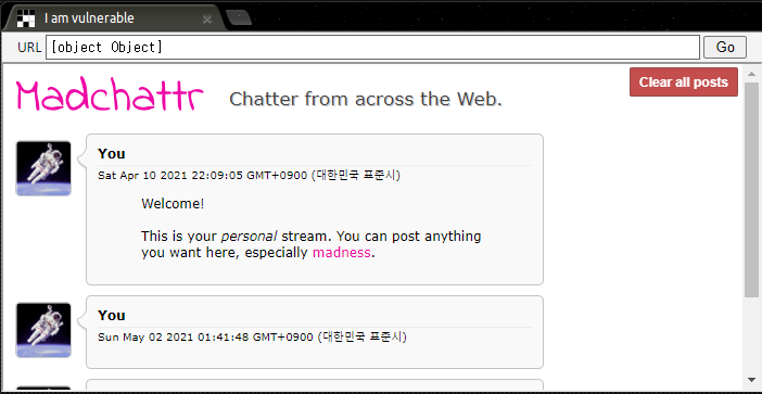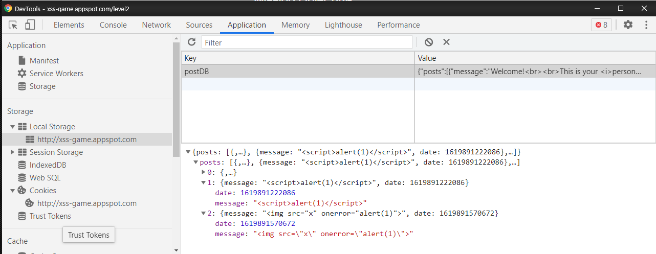 하지만 예상과는 다르게 script 는 어떠한 필터링 없이도 잘 들어갔으나 여전히 alert는 동작하지 않았다. 그리고 사실 여기에는 당연한 이유가 있었다. 조금 더 분석해본 결과, input에 글을 입력하여 "Share status" 버튼을 눌러 글을 작성하게 되면, 글은 서버에 올라가는 것이 아니라 Local Storage에 javascript를 이용하여 저장이 된다. 그리고 새로고침을 통해서 글을 불러오게 될 경우에는 javascript 에서 페이지를 불러오고 페이지가 모두 렌더링 된 이후에 글 내용을 불러와서 삽입하는 방식으로 구현되어 있다.