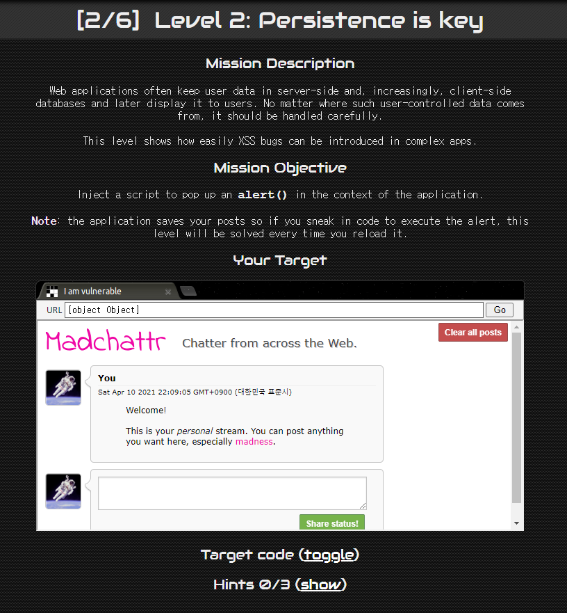| XSS-Game - Level 3: That sinking feeling... (Writeup/문제풀이) (0) | 2021.05.04 |