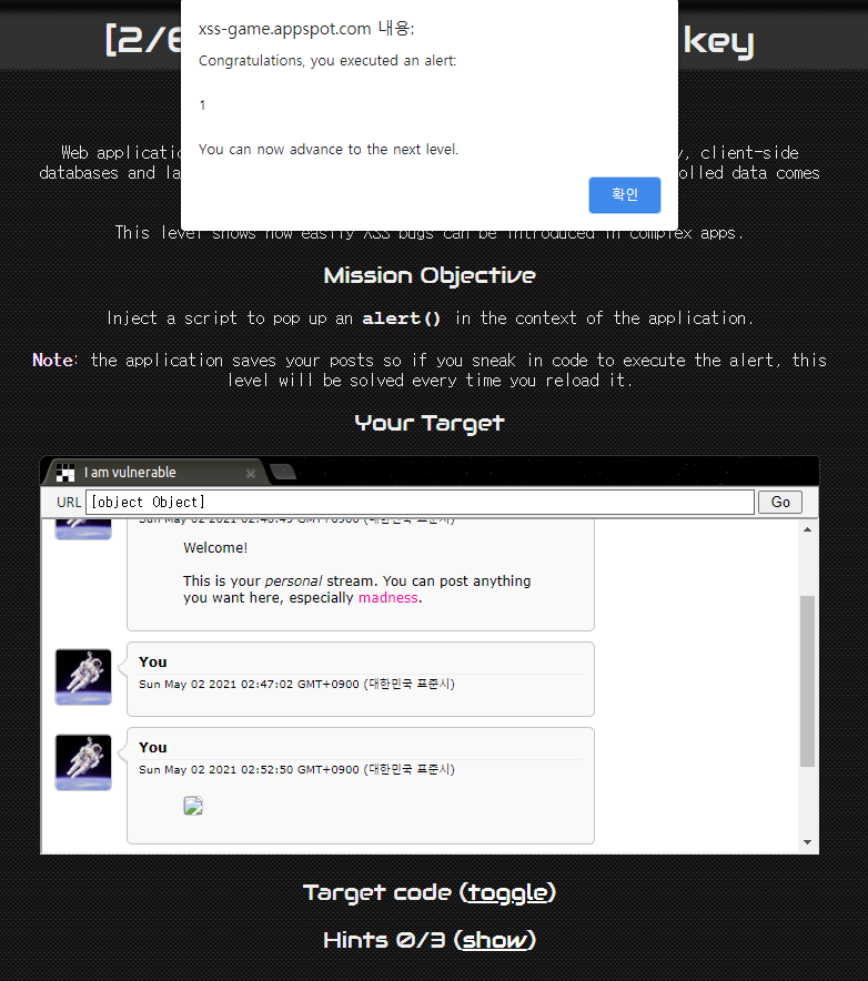 두 번째 단계에서도 1단계와 동일하게 alert() 를 페이지 내에 삽입(inject)하면 되는 문제다. 그래서 1단계와 동일하게 input 내용에 아래와 같이 입력해보았다.
