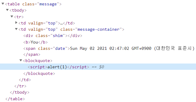 하지만 alert 는 발생하지 않았고, 내가 입력한 내용 또한 드러나지 않았다. 그래서 소스코드를 직접 확인해본다.