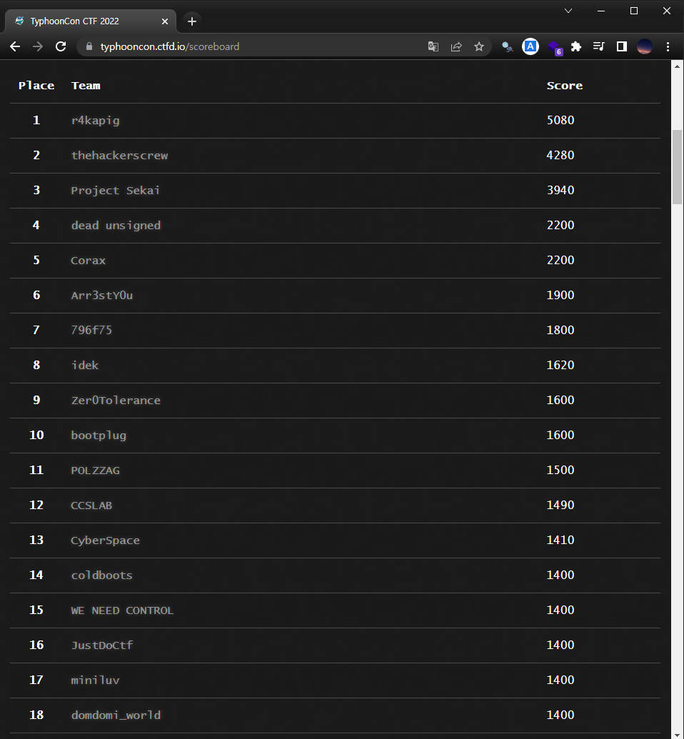 무튼 마지막 문제까지 풀어서 진짜 운좋게 18등이 되었습니다. 높은 등수는 아니지만 웹문제를 다 푼 것만으로 정말 만족하게 되는 대회였습니다. 문제 사이트는 아직 닫히지 않은 것인지, 나중에 기회되면 천천히 문제풀이도 작성해볼 생각입니다.