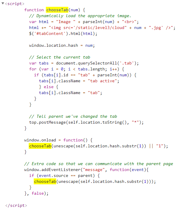 하지만 예상외로 alert 가 나오지 않았는데, 그 이유는 다음과 같다. 아래 script는 페이지가 처음 로딩 될 때 정의되고 실행되는 스크립트이다. 우선 chooseTab이란 함수가 정의되고, window 가 로딩이 되었을 때 chooseTab(unescape(self.location.hash.substr(1)) || "1") 가 실행된다고 한다.