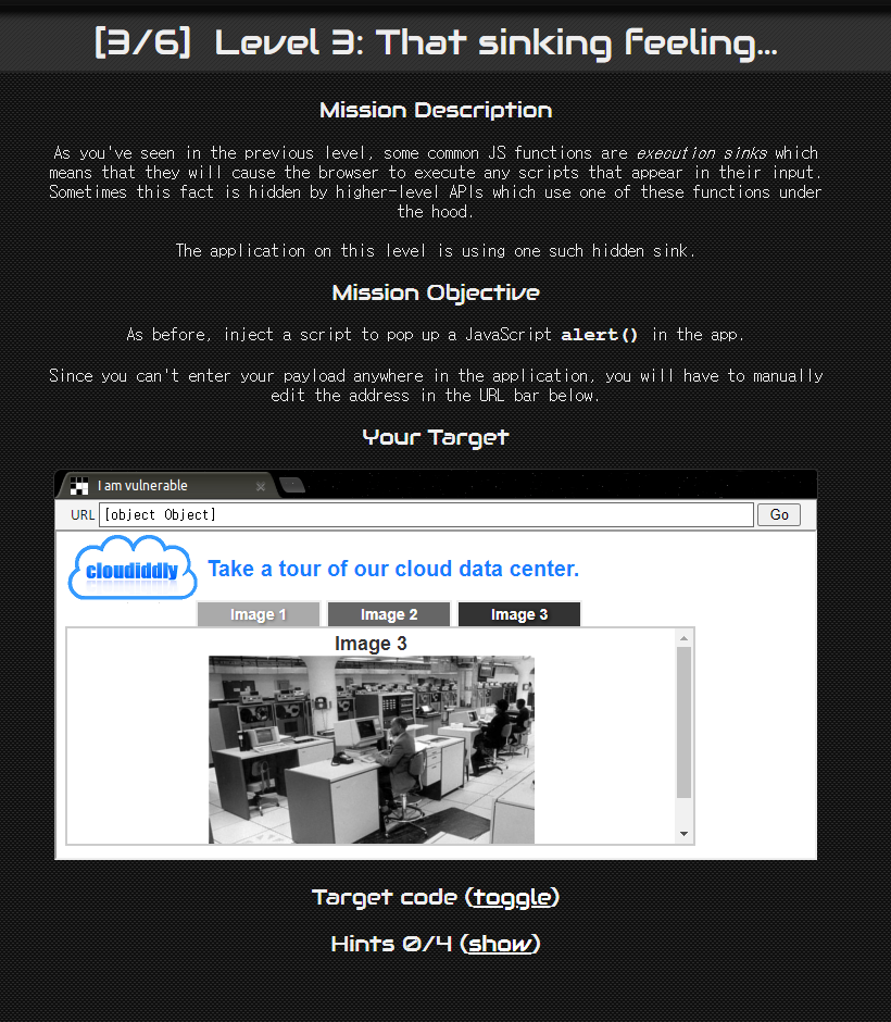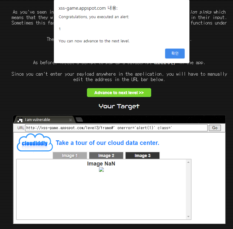 3단계에서는 어떤 input 입력란이 없었다. 마찬가지로 alert 를 띄우면 되는 문제인데, image 1, image 2, image 3 버튼을 눌러보았을 때 URL이 변경되는 걸 확인할 수 있다. 아래는 image 3 을 눌렀을 때 URL인데 frame#3 이 의미심장하다. 이 곳에 한번 다른 문자열을 임의로 입력해보겠다.
