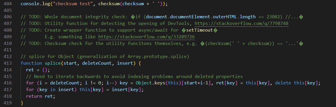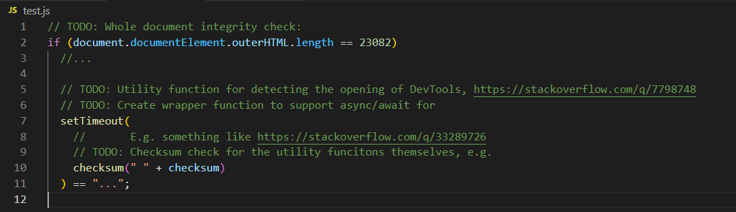 이상하게 주석문에서 document.docuementElement.outerHTML.length 와 setTimeout 이 주석이 아니라 소스코드로 읽혀지고 있는 것이 보였습니다.