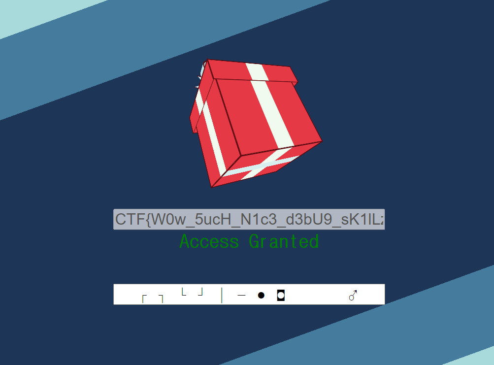 /* s |L Q4 */ /* s |L M */ /* Se` h@*/ /* ( ) N) H 5! =X*/ /* +d v=A (( */ /* (*/ (/^CTF{([0-9a-zA-Z_@!?-]+)}$/.exec(
