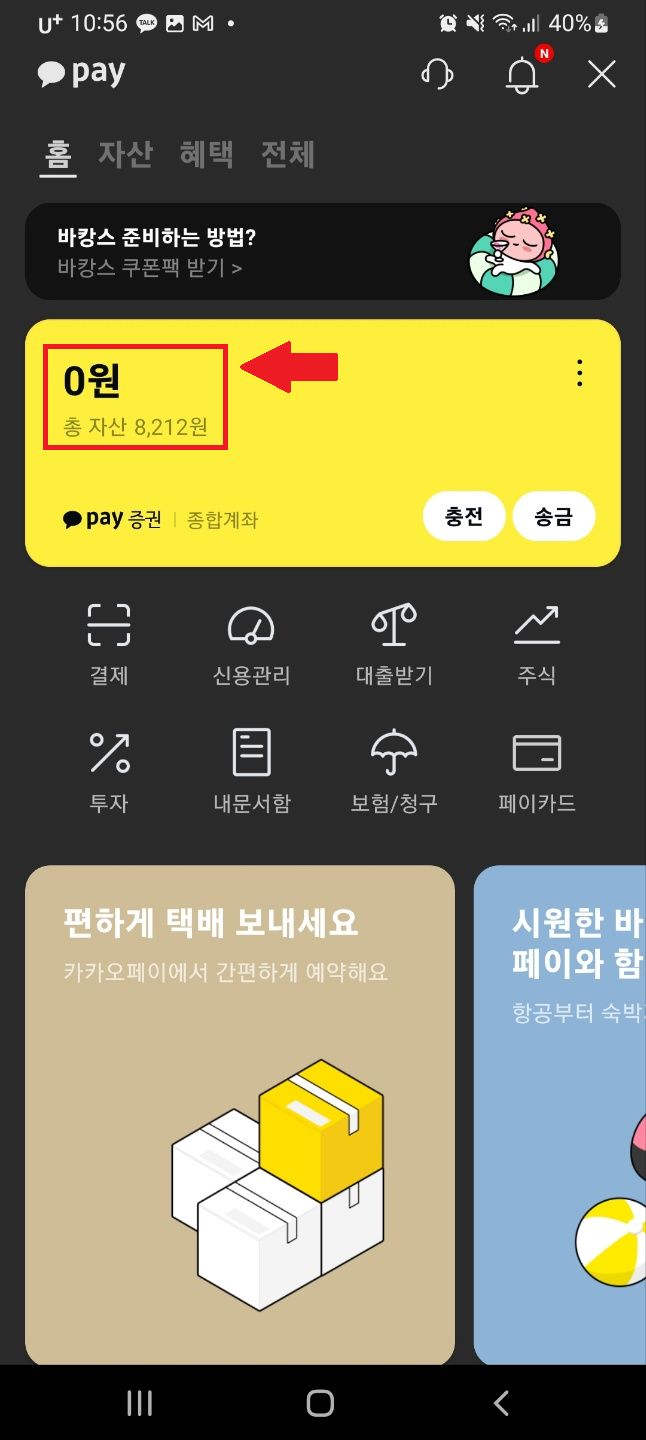 카카오페이 화면에서 금액이 있는 부분을 터치해서 클릭해줍니다. (저는 돈을 다 써서 0원이네요)