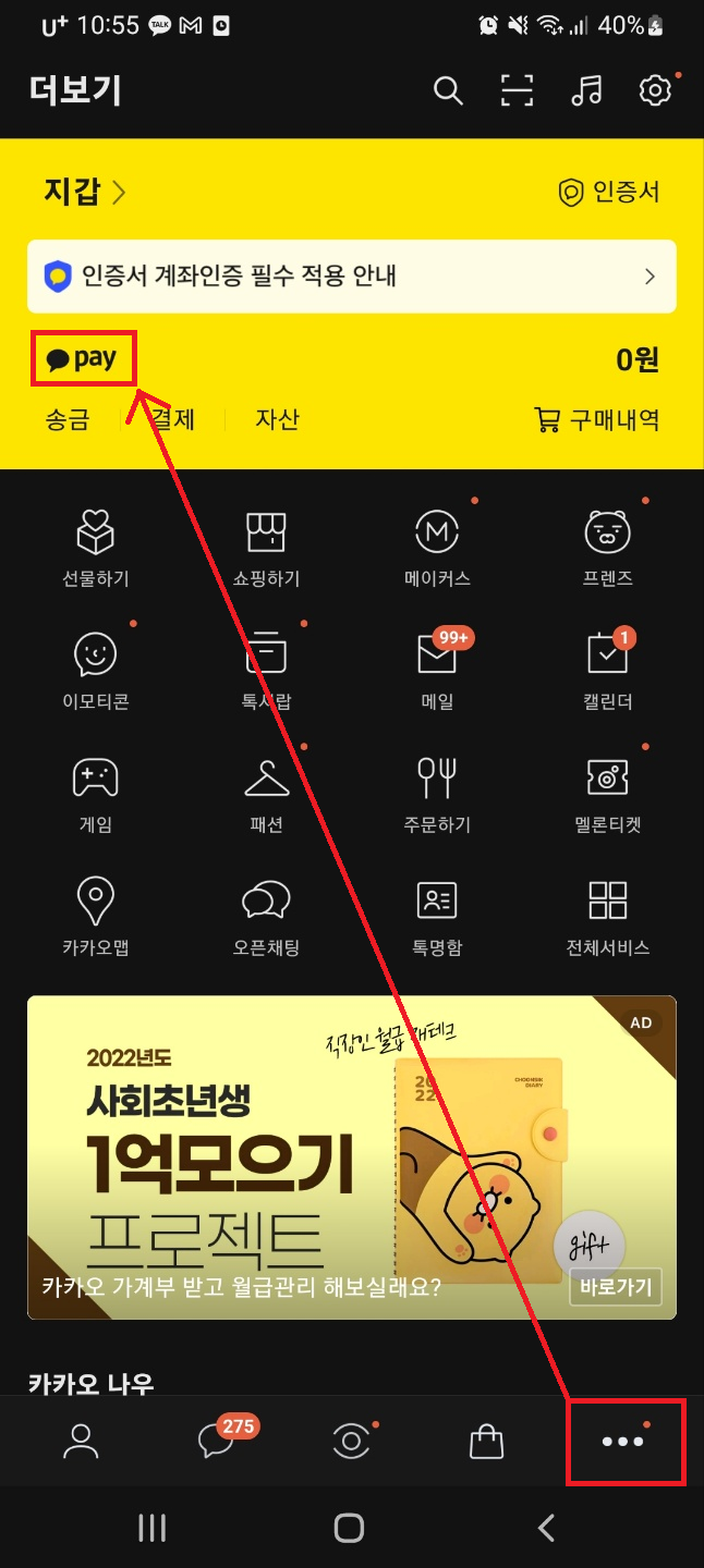 카카오톡 우측 하단의 ▪▪▪ 더보기 버튼을 클릭한 뒤 PAY 버튼을 눌러 카카오페이로 진입해줍니다.