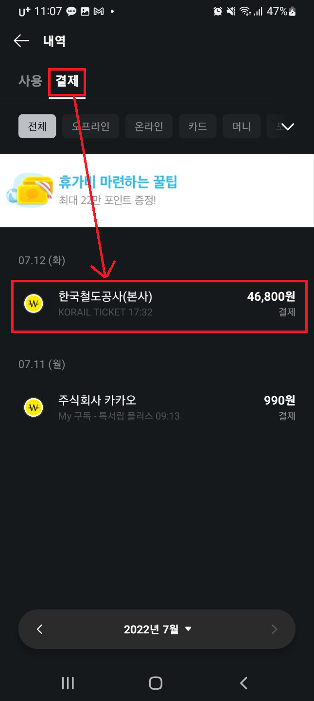 근데 제가 대중 교통을 이용할 때 습관적으로 카카오페이로 결제했더라구요.