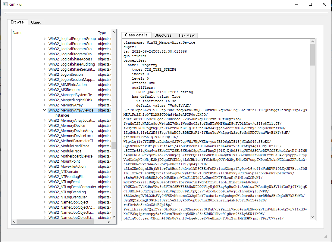 어떤 값을 읽어오려는지 한번 보겠습니다. root\CIMV2\ 에 정의되어 있는 클래스 중 Win32_MemoryArrayDevice 클래스의 Properties 중에서 Property 라는 이름의 default value 에 정의되어 있는 문자열은 아래와 같았습니다.